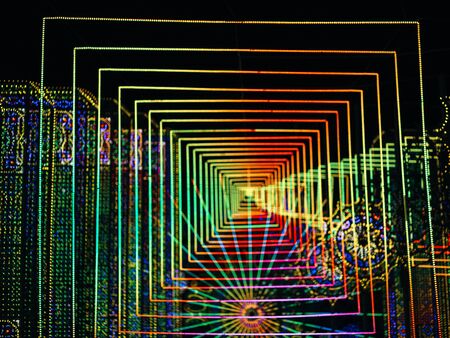 Sightseeing, visual, digital, contemporary art concept. Blinking video mapping multimedia show projected on hanging textile or plastic decorative construction in dark room with low light illumination