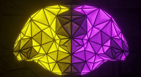 A geometric structure resembling a brain is depicted, with its surface composed of numerous interconnected triangles and polygons. The left hemisphere is bathed in a bright yellow light, while the right hemisphere glows with a vivid purple neon light. The intricate facets and sharp edges create a complex and visually engaging form. The dark background isolates the illuminated emphasizing its abstract and technological nature, suggesting themes of intelligence or data.