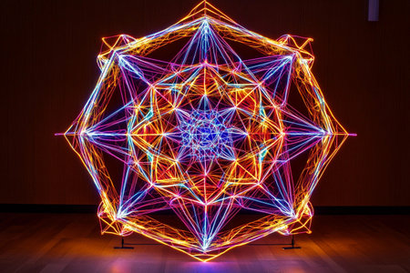 A dynamic arrangement of glowing neon tubes forms an intricate geometric pattern, featuring interconnected lines in bright pink, blue, yellow, and orange hues.