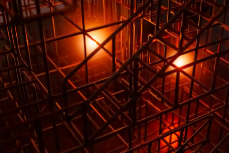 Abstract background of LED lights in a black and white cage. 3d rendering