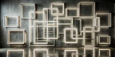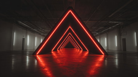 Bright neon lights in geometric pattern illuminating futuristic dark room