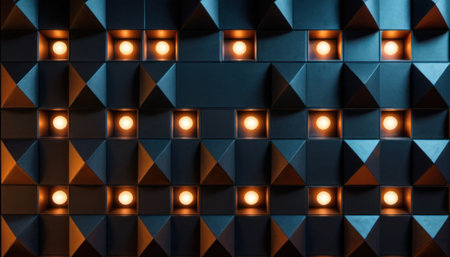 3d rendering of abstract geometric background. Modern dark blue and black wall with glowing lamps