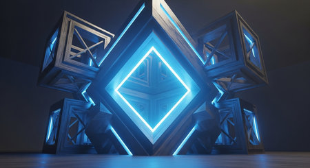 3d rendering of abstract geometric shape with blue neon lights in empty room