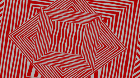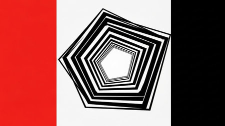 An optical illusion of a pentagonal tunnel created with black and white stripes, bordered by red and black...