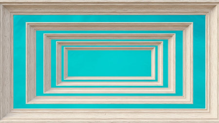 Nested wooden frames create a visual tunnel effect against a bright turquoise blue background, emphasizing depth.