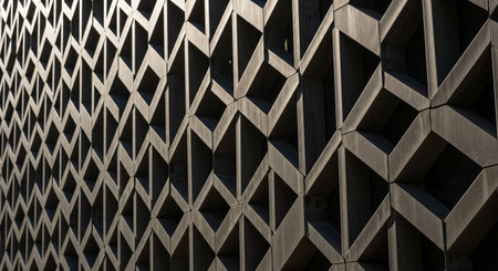 A close-up view of a grey concrete building facade featuring a repeating geometric diamond pattern with strong...
