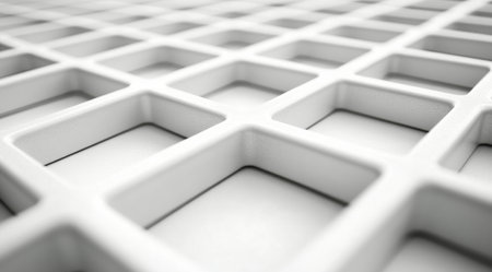 This textured white grid features evenly spaced square patterns, creating a visual play of light and shadow. The clean lines highlight the simplicity and modernity of the design, embodying minimalistic aesthetics.