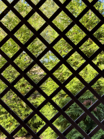 Chain link fencing behind a wooden lattice.