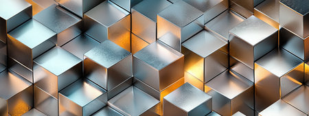Abstract background from metal cubes with random offset effect. The glass inside the cubes reflects light. 3d illustration