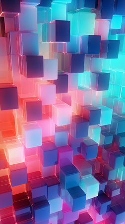 A futuristic, colorful abstract background with an array of glowing, floating cubes. The suspended, radiant shapes in electric yellow, deep sapphire, and neon coral create a high-tech, sci-fi, and visually mesmerizing scene.