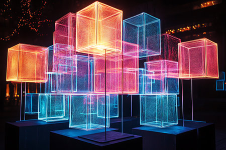 An array of geometric cubes illuminated with vibrant LED lights against a dark background, creating a dynamic and colorful display.. AI Generation