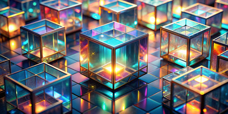 An intricate geometric pattern featuring transparent glass cubes in various sizes, arranged symmetrically on a dark background, with light reflections creating a mesmerizing effect.