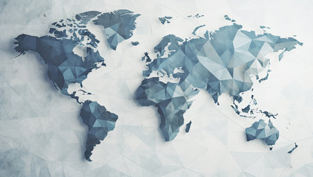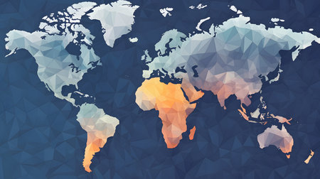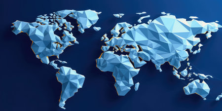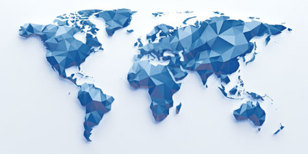 Low poly three dimensional bass relief world map with interconnected polygons. Wall art decoration idea.