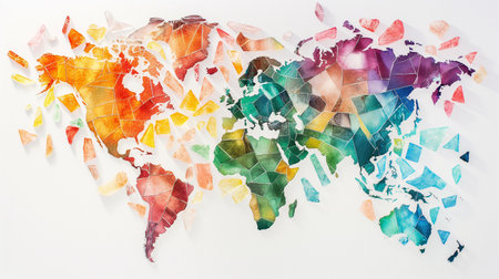 A stunning artwork depicting a colorful mosaic world map with intricate geometric patterns and vibrant hues. Perfect for decor and cultural representation.