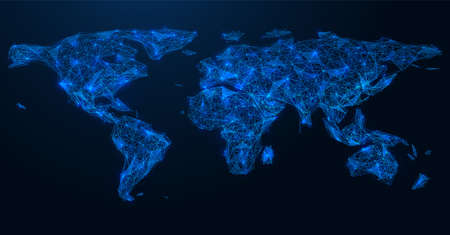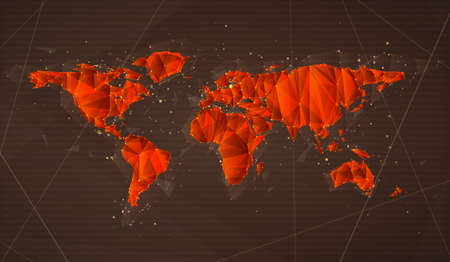 Polygonal world map on a dark background. The various bright world map made from polygon material. Geometric and digital data concept. Design for modern graphics, infographic, web background. AIG35.