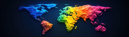 Polygonal rainbowcolored world map on dark blue, flat style with soft shadows