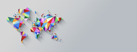 World map shape made of colorful polygons. 3D illustration isolated on a white background. Horizontal banner