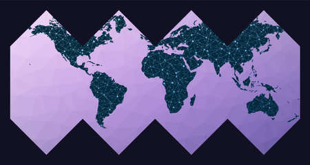 Abstract telecommunication world map. Cylindrical equal-area projection. World network map. Wired globe in Cylindrical Equal Area projection on geometric low poly background.