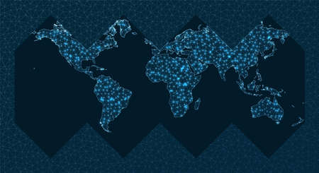 Abstract telecommunication world map. HEALPix projection. World network map. Wired globe in Healpix projection on geometric low poly background. Artistic vector illustration.