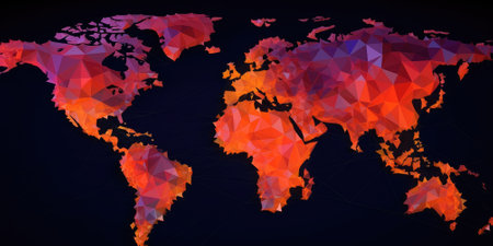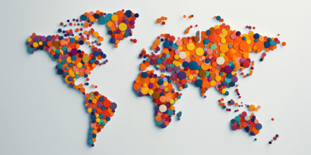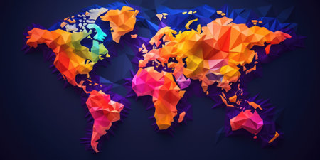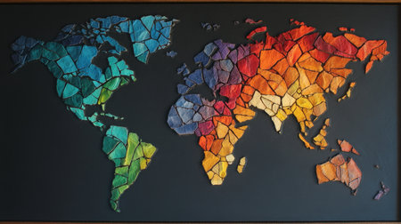 A stunning abstract representation of a world map crafted from mosaic tiles in vibrant colors, set against a dark background for striking contrast.