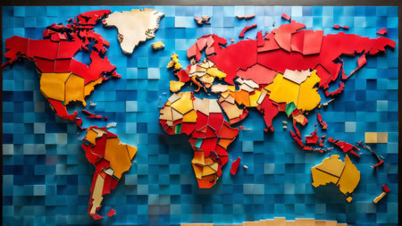Fragments of a global map illustrate various countries and continents through detailed textures and colors, highlighting geographic diversity and boundaries.
