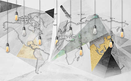 3d illustration, abstract gray background with a silhouette of the world map and hanging retro light bulbs