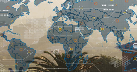 Displaying map overlay with data markers and connecting lines over city skyline and palm trees. Geospatial, technology, urban, connectivity, futuristic, data visualization, commercial