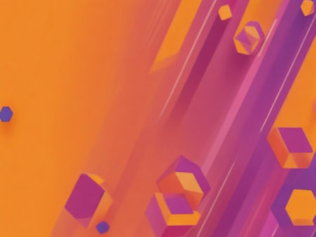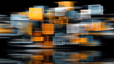 An abstract artwork features a dynamic arrangement of translucent cubes, with varying sizes and colors. The image showcases a sense of movement with blurred lines, primarily using orange and blue hues against a deep black backdrop. Suitable for a range of commercial applications, the image evokes a sense of technology and creativity.