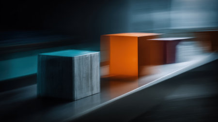 This abstract image features several colored cubes arranged on a surface. The cubes vary in size and color, with a blurred effect adding a sense of movement. The composition uses a shallow depth of field, set against a dark, possibly indoor, environment, which creates a dramatic effect. Suitable for various design and commercial applications.
