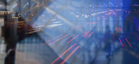 Highly technical modern urban background with movement and overlay elements of skyscrapers and highway in deep blur with blue color correction and light rays. Concept of constant motion and speed.