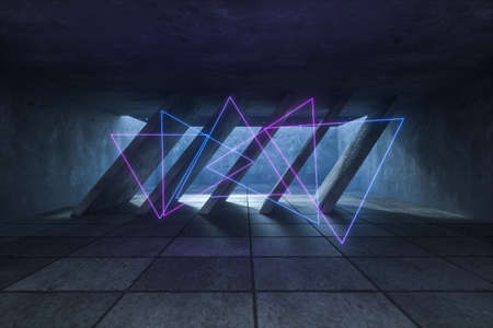 3d render. Geometric figure in neon light against a dark tunnel. Laser glow.