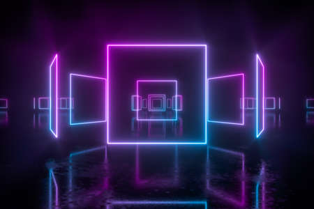 Neon square frame in dark room. 3D rendering background.