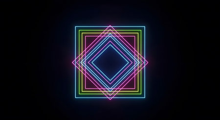 Neon square frames dark backdrop. Vibrant design. Futuristic style