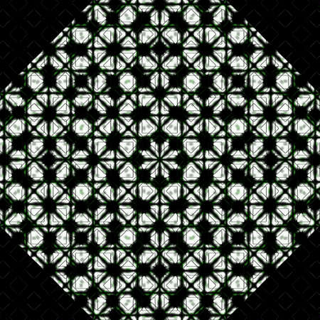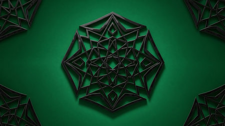 A detailed black geometric mandala with an octagonal shape and intricate linear patterns is centered on a textured dark green background with repeating elements.
