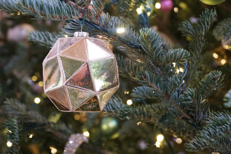 Beautiful gold ornament hanging on a lighted Christmas tree