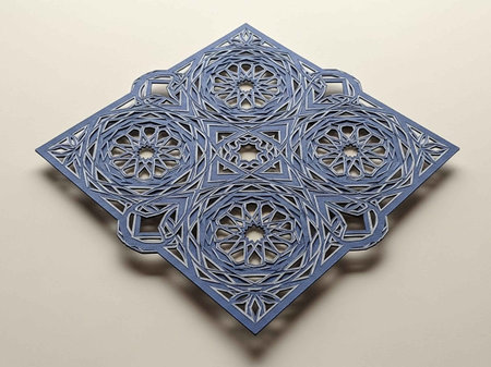 A detailed and intricate Islamic geometric pattern fills the frame with repeating star and polygon shapes in blue and white tones.