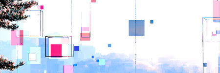 Colorful geometric shapes float across a soft landscape backdrop, blending modern art with a calm, serene environment in bright daylight.