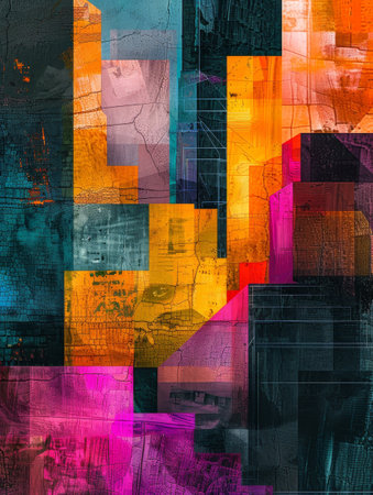 Vibrant hues in a Cubism art style, abstract urban setting, digital abstract painting.