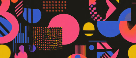 A geometric seamless pattern inspired by Bauhaus and Swiss design principles. Featuring bold, colorful abstract shapes, its perfect for modern design projects, textiles, and creative branding