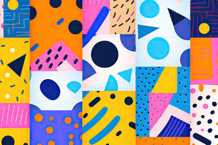 Colorful and bold retro-inspired pattern featuring a variety of shapes and colors, A retro 80s inspired grid pattern with bold geometric shapes
