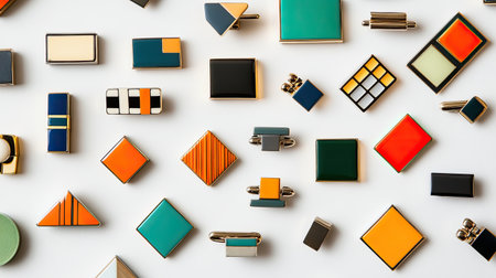 A captivating assortment of colorful geometric jewelry pieces arranged on a white background, perfect for inspiration in fashion and design projects.