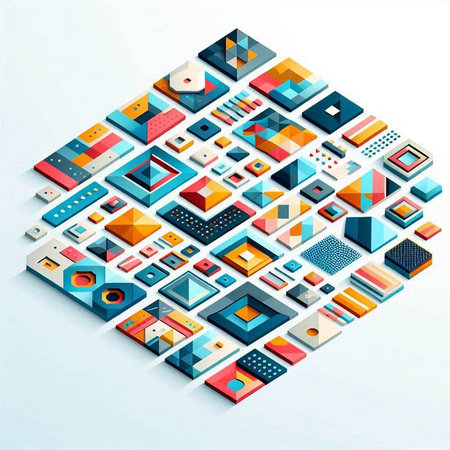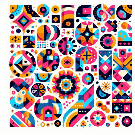Colorful geometric shapes and patterns in vibrant tonal contrast ideal for modern design, backgrounds, or creative projects, featuring bold colors and dynamic arrangements