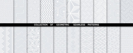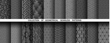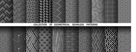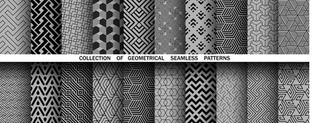 A diverse collection of seamless geometric patterns in black, white, and gray tones. This vector background set includes various designs such as stripes, hexagons, circles, triangles, squares, labyrinths, chevrons, bricks, and grids, suitable for abstract and modern graphic design projects, wallpapers, fabrics, and decorative prints.