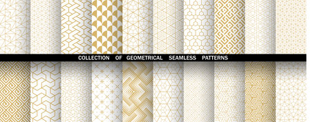 Geometric collection of gold and white patterns. Seamless vector backgrounds. Simple graphics