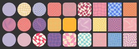 Groovy checkered pattern, colorful tiled grid. Vintage wavy curved backdrop, distortion effect. Funky geometric chessboard texture, retro background in 90s style, y2k. Vector illustration
