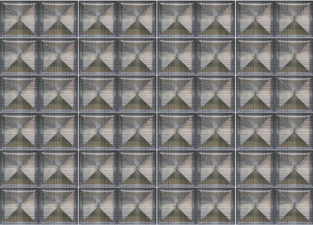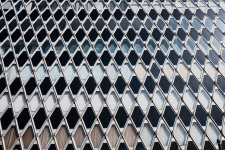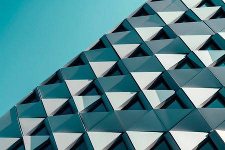 Geometric rhombus pattern on the metal facade of a building in the sun.