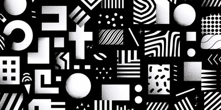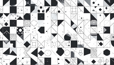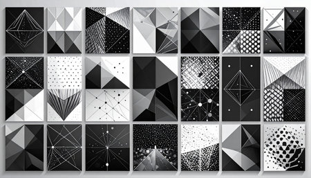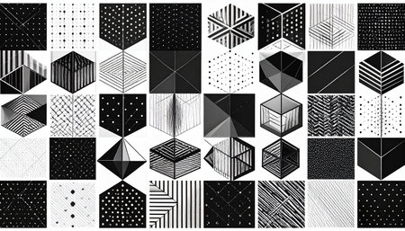 A grid of monochrome abstract featuring geometric shapes and patterns. include cubes in isometric perspective, hexagonal and diamond shapes, grids of dots, parallel lines, and textured patterns. The color palette is strictly black and white, creating a stark, aesthetic.