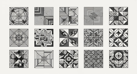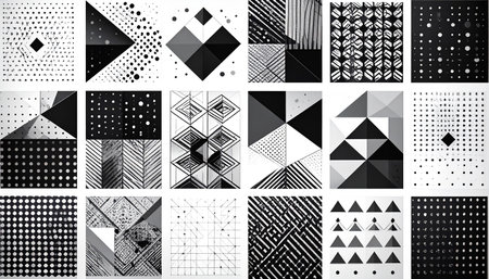 A collection of 20 square monochrome arranged in a 4x5 grid. Each abstract geometric patterns and textures in black, white, and shades of gray. include arrangements of dots, lines, triangles, squares, and grids, with varying densities and styles.