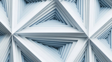 A striking geometric abstract pattern is formed by an intricate arrangement of nested white triangles. The layers of triangles recede into a deep perspective, creating a sense of depth and an almost architectural illusion. The symmetrical and repeating nature of the gives it a modern and minimalist aesthetic. This visually engaging pattern could serve as a background or a in various contexts, offering a clean and visual.