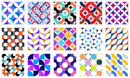 Geometric abstract seamless patterns set with colorful simple elements of geometry, wallpaper background in retro 70s style, Bauhaus constructive style tiles collection.